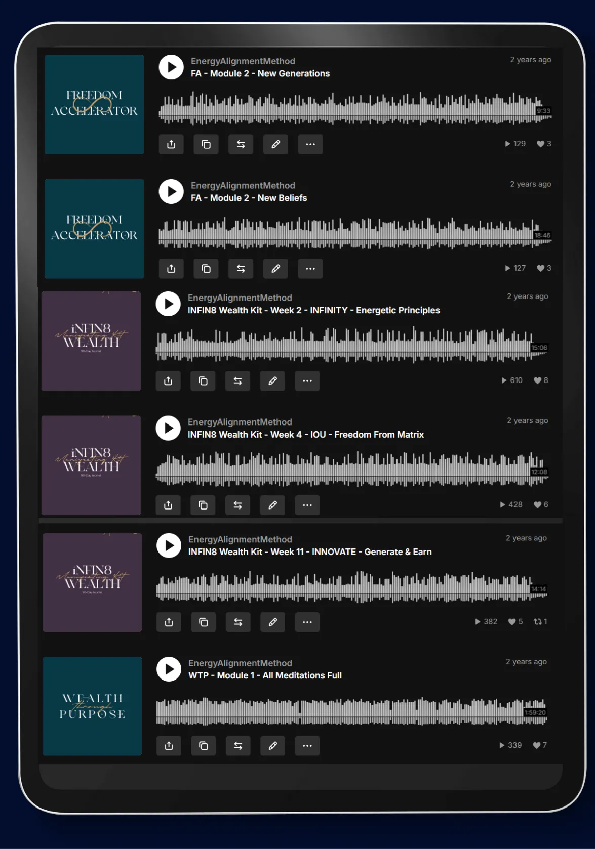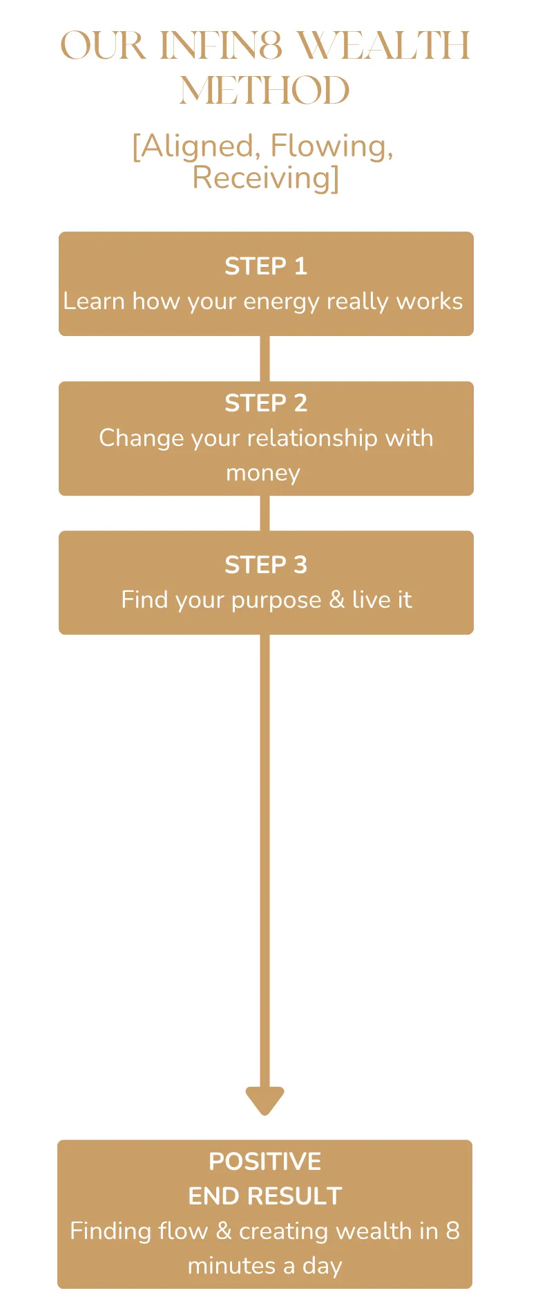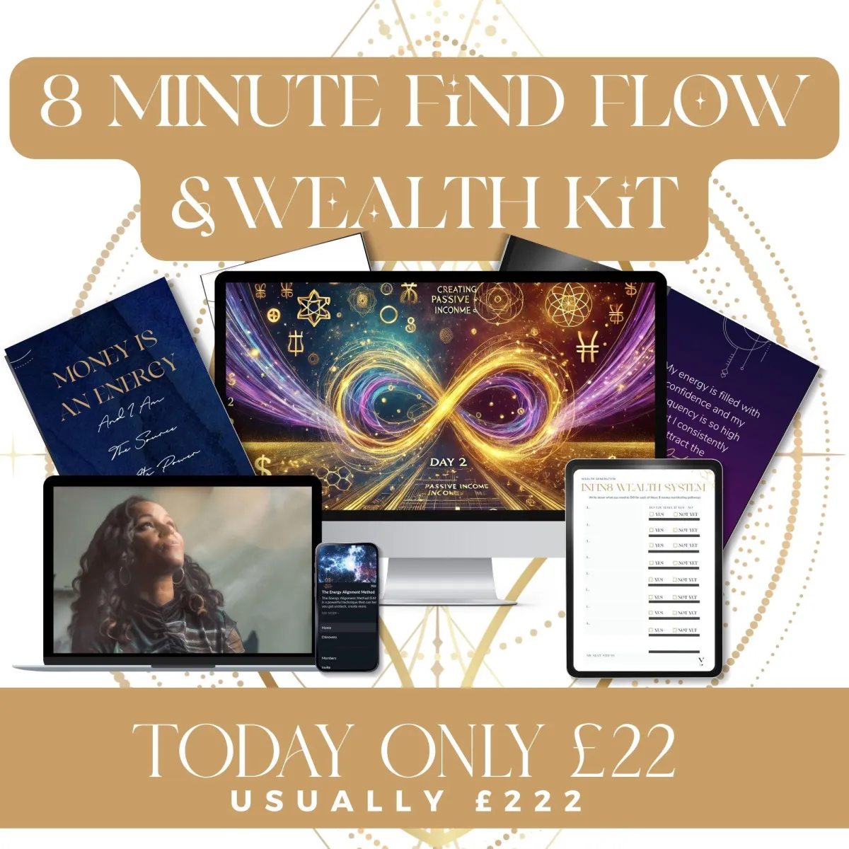 A proven 8-day system that teaches you The Energy Alignment Method® combined with INFIN8 WEALTH principles to create wealth flow in just 8 minutes a day.