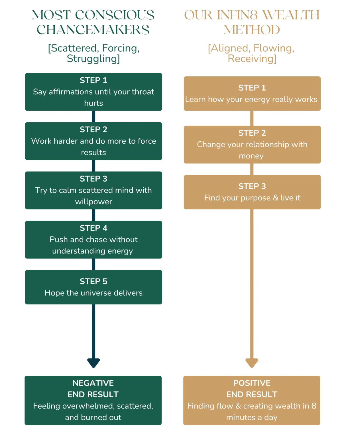 This method does the opposite - it teaches you to slow down, align your energy first, and let wealth flow by learning and using the process of creation.